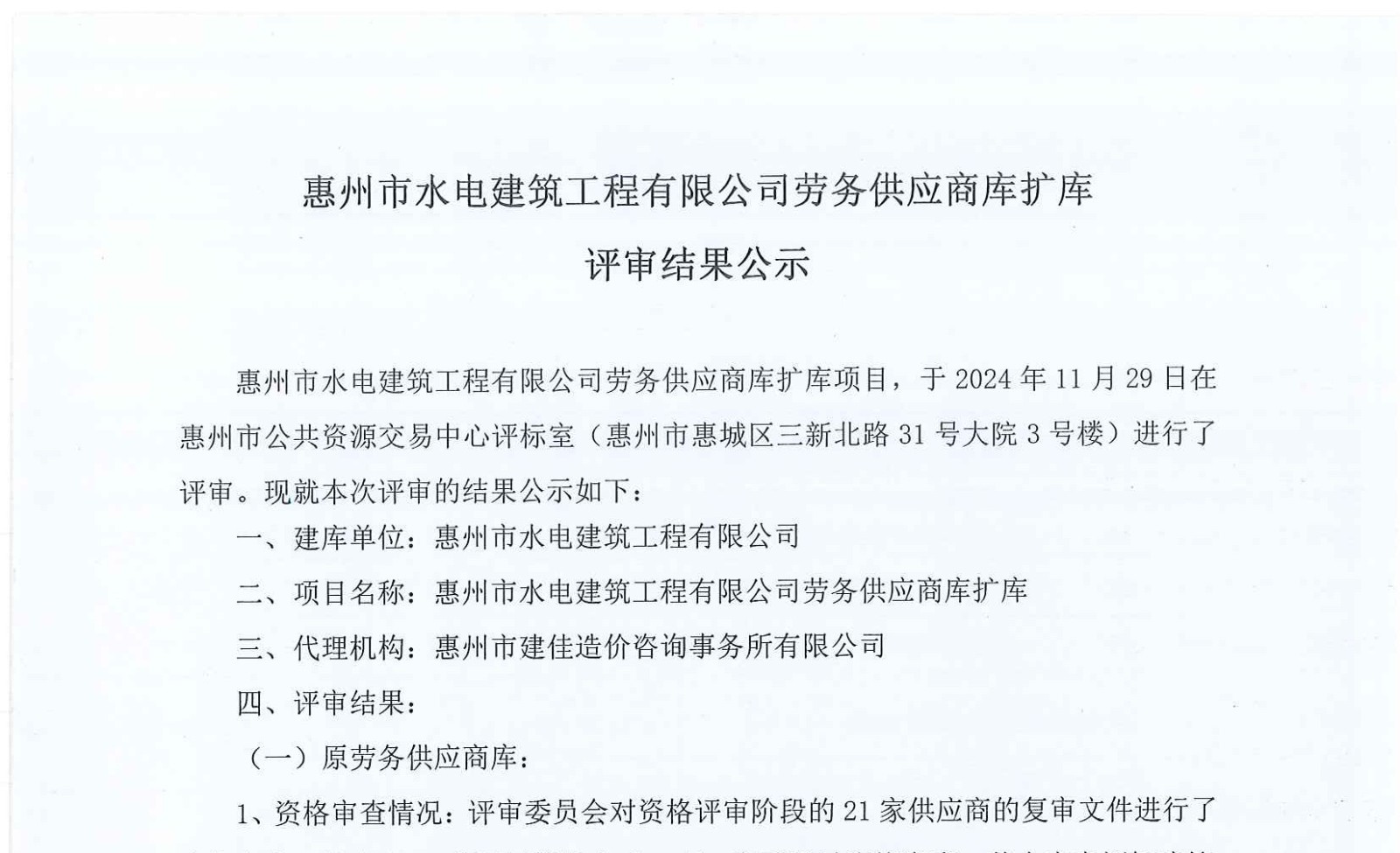 惠州市水電建筑工程有限公司勞務(wù)供應(yīng)商庫擴(kuò)庫評(píng)審結(jié)果公示......