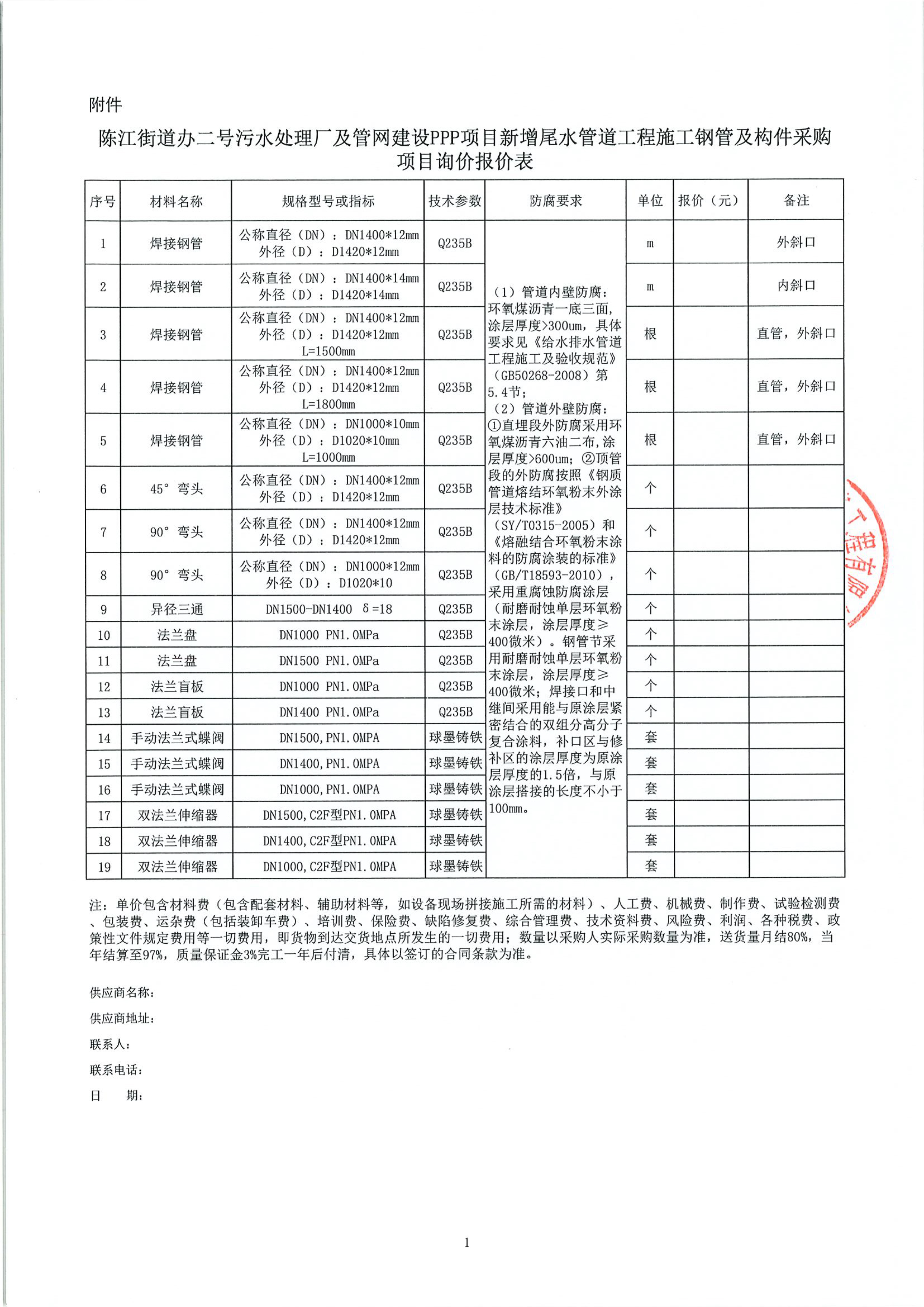 陳江街道辦二號(hào)污水處理廠及管網(wǎng)建設(shè)PPP項(xiàng)目新增尾水管道工程鋼管及構(gòu)件采購項(xiàng)目詢價(jià)公告