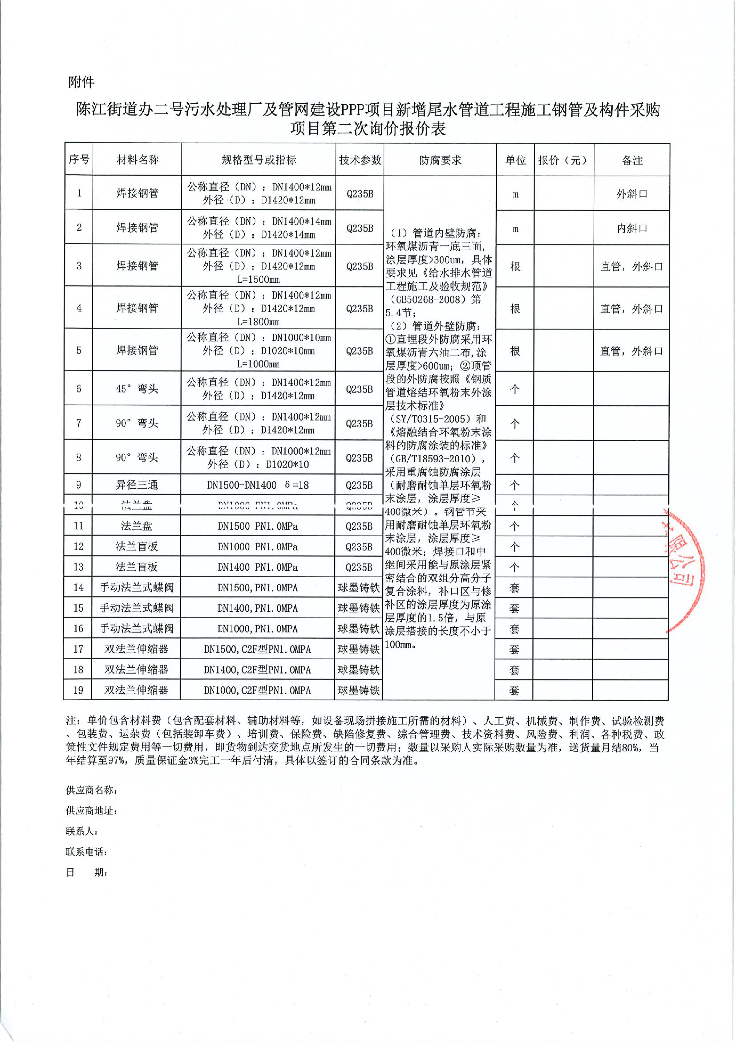 陳江街道辦二號污水處理廠及管網(wǎng)建設(shè)PPP項目新增尾水管道工程鋼管及構(gòu)件采購項目第二次詢價公告附件: