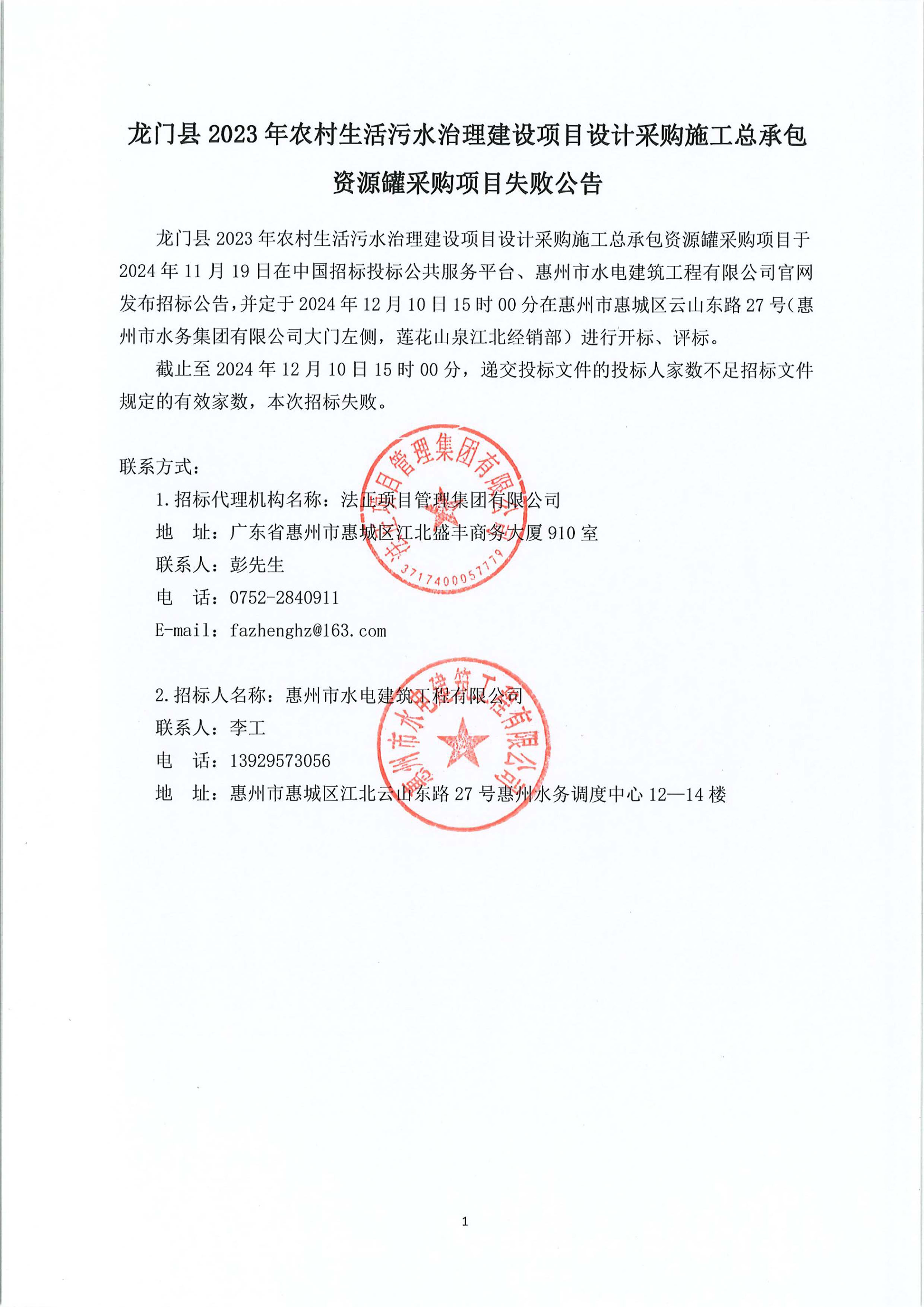 龍門縣2023年農(nóng)村生活污水治理建設項目設計采購施工總承包資源罐采購項目失敗公告