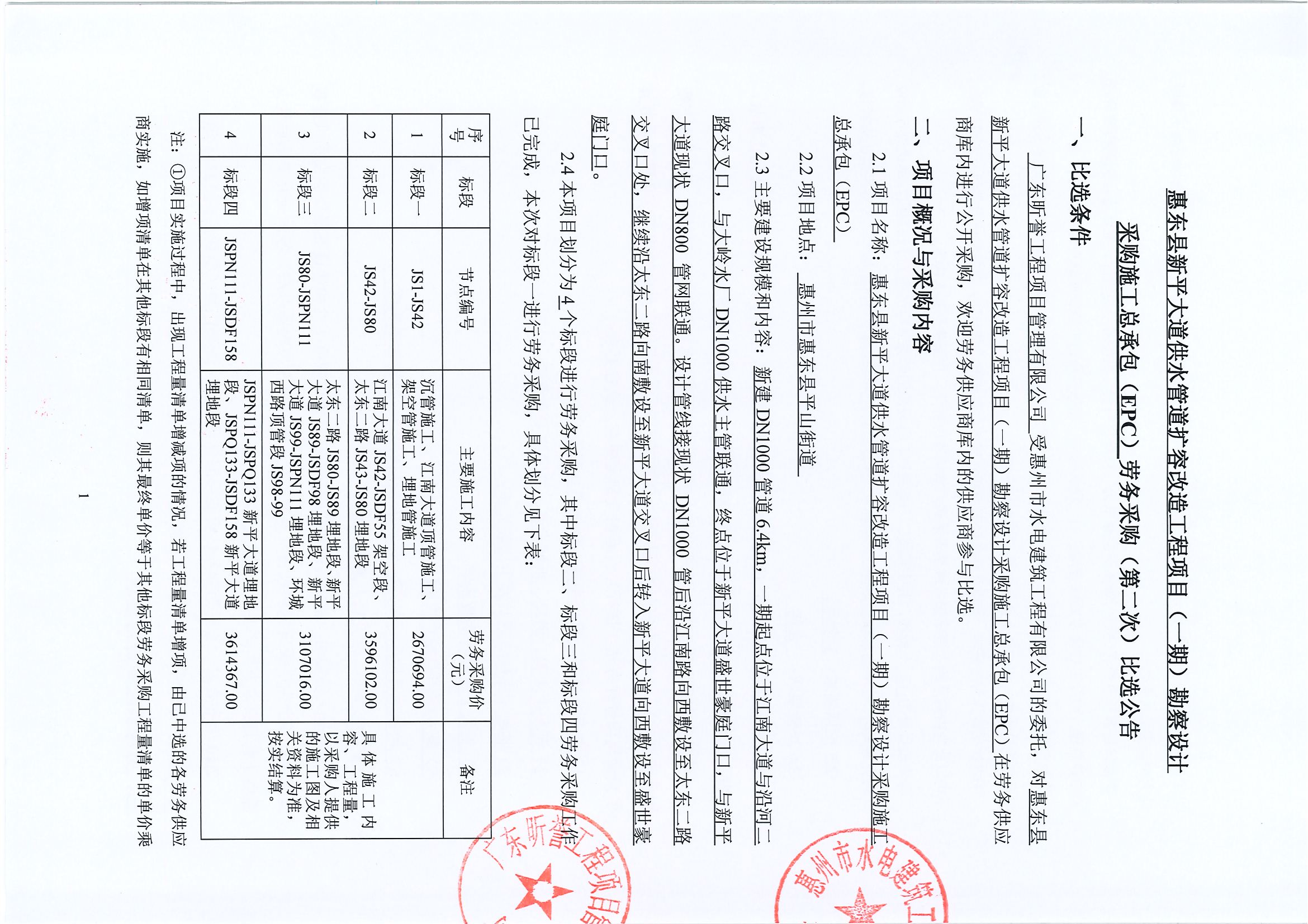 惠東縣新平大道供水管道擴(kuò)容改造工程項(xiàng)目(一期)勘察設(shè)計(jì) 采購施工總承包(EPC)勞務(wù)采購(第二次)比選公告