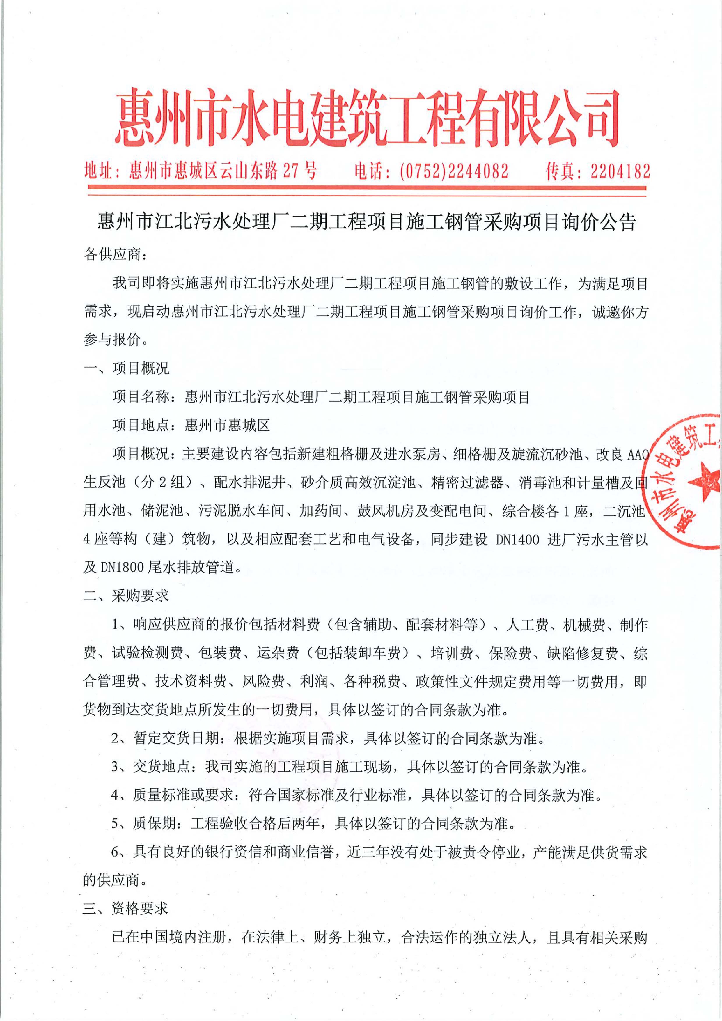 惠州市江北污水處理廠二期工程項目施工鋼管采購項目詢價公告