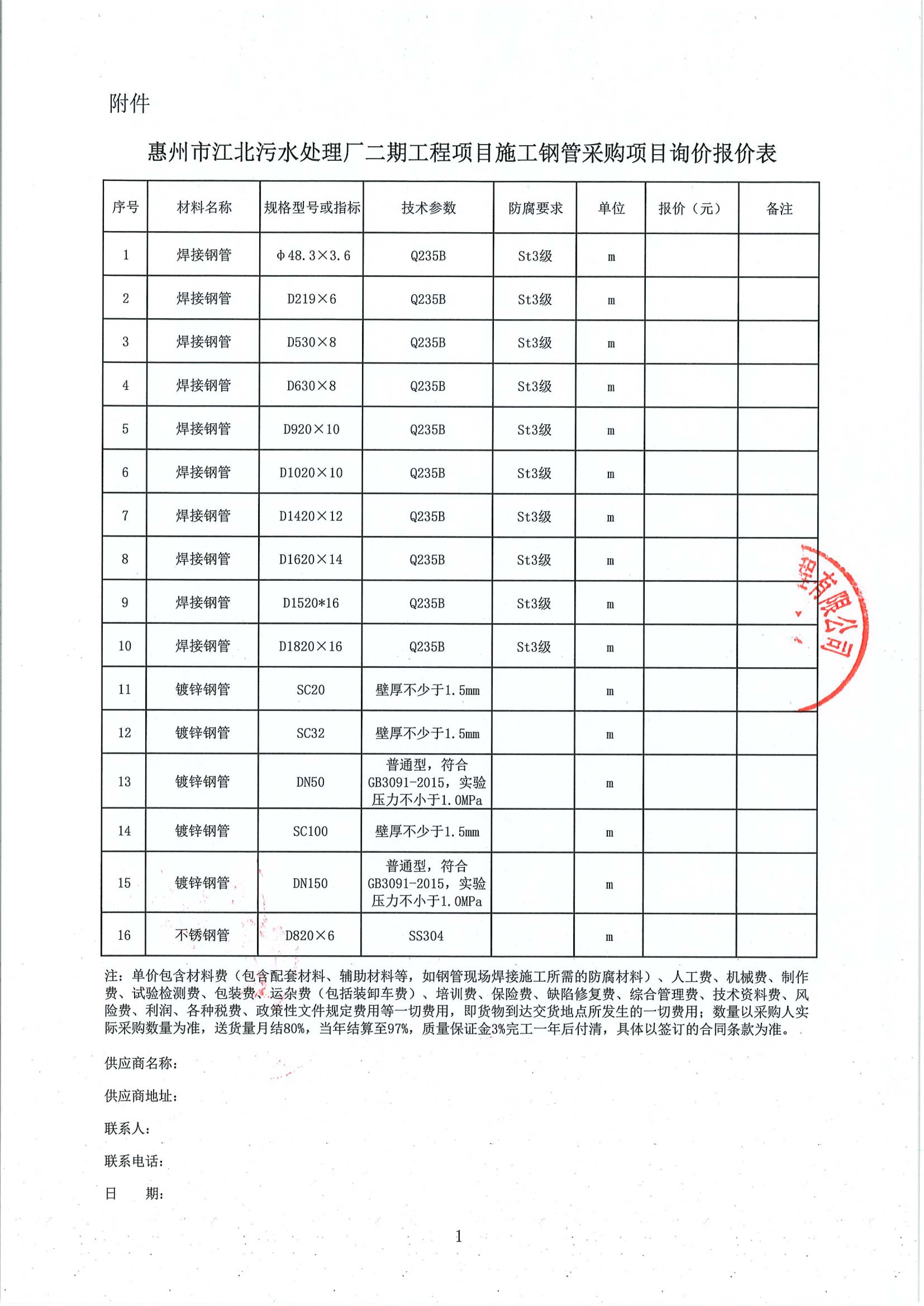 惠州市江北污水處理廠二期工程項目施工鋼管采購項目詢價公告附件: