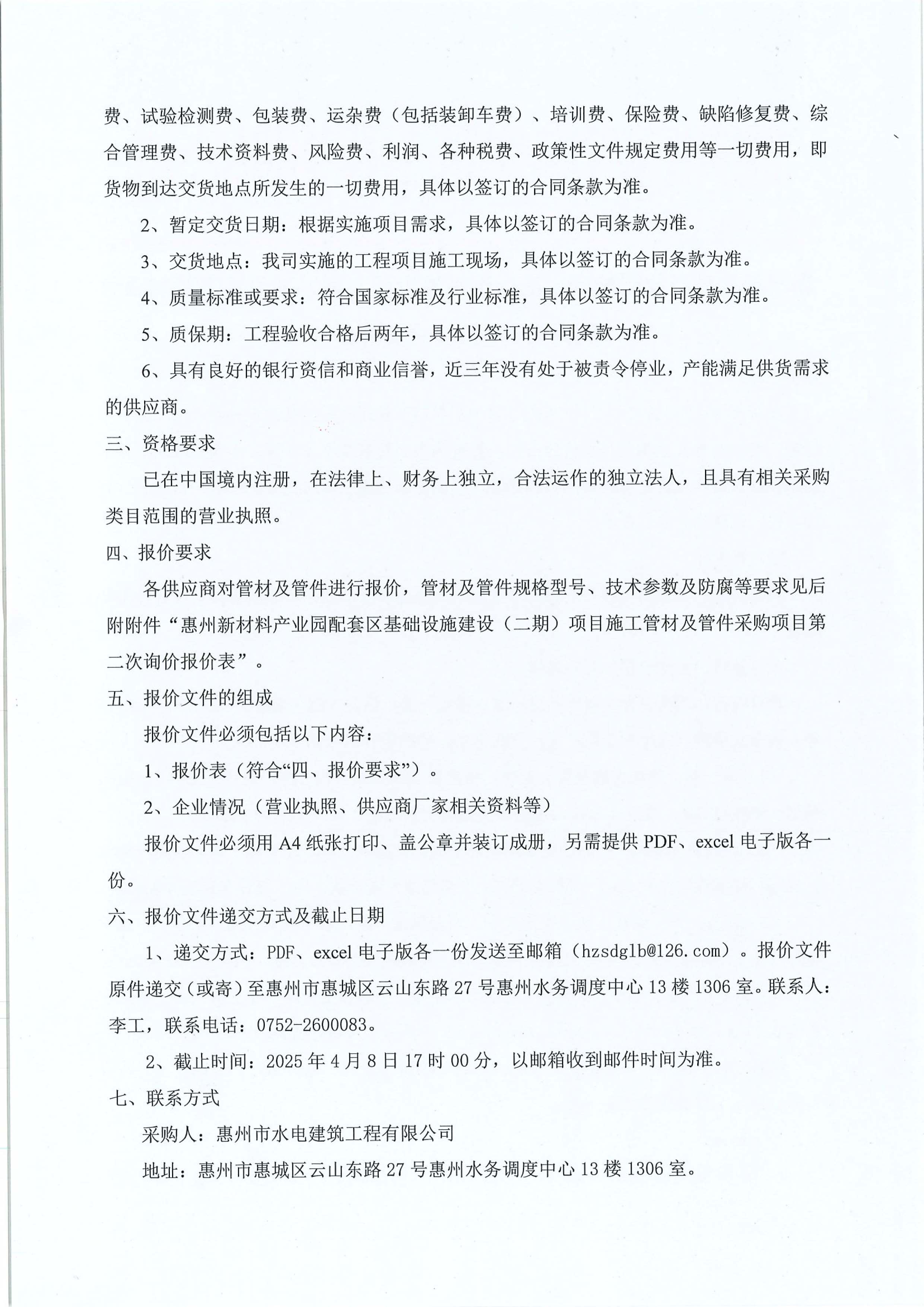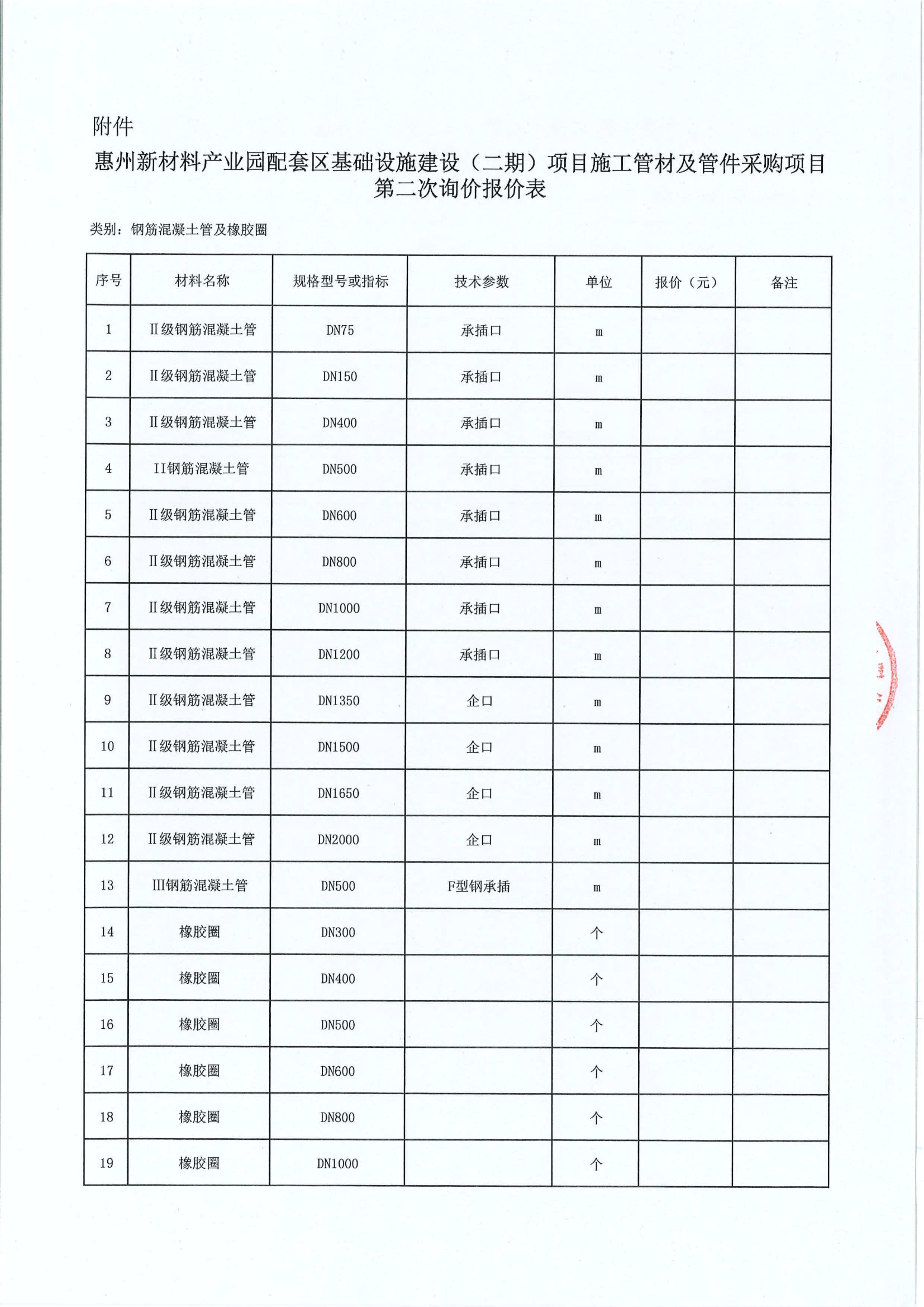 附件:惠州新材料產(chǎn)業(yè)園配套區(qū)基礎(chǔ)設(shè)施建設(shè)(二期)項(xiàng)目施工管材及管件采購項(xiàng)目第二次詢價(jià)報(bào)價(jià)表