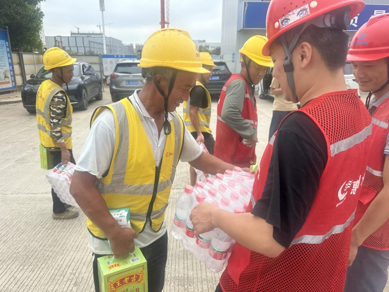 活動(dòng)現(xiàn)場(chǎng),臨時(shí)黨支部成員與項(xiàng)目部工作人員化身“清涼使者”,將藿香正氣水、王老吉涼茶、礦泉水等防暑降溫物資一一遞到工人手中?!疤鞖庋谉幔欢ㄒ⒁夥朗?,合理安排作業(yè)時(shí)間!”他們一邊發(fā)放物資,一邊反復(fù)叮囑工人們做好自我防護(hù),科學(xué)調(diào)整作息,確保安全生產(chǎn)。接過(guò)物資的工人們臉上洋溢著笑容,紛紛對(duì)這份及時(shí)的關(guān)懷表示感謝。