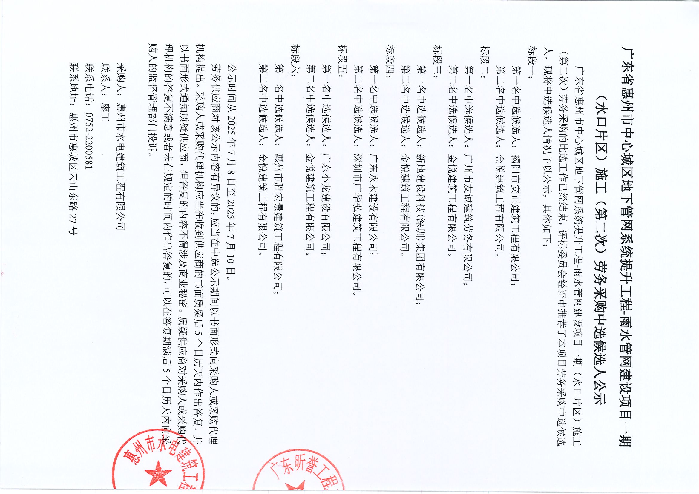 廣東省惠州市中心城區(qū)地下管網(wǎng)系統(tǒng)提升工程-雨水管網(wǎng)建設(shè)項目一期(水口片區(qū))施工(第二次)勞務(wù)采購中選候選人公示