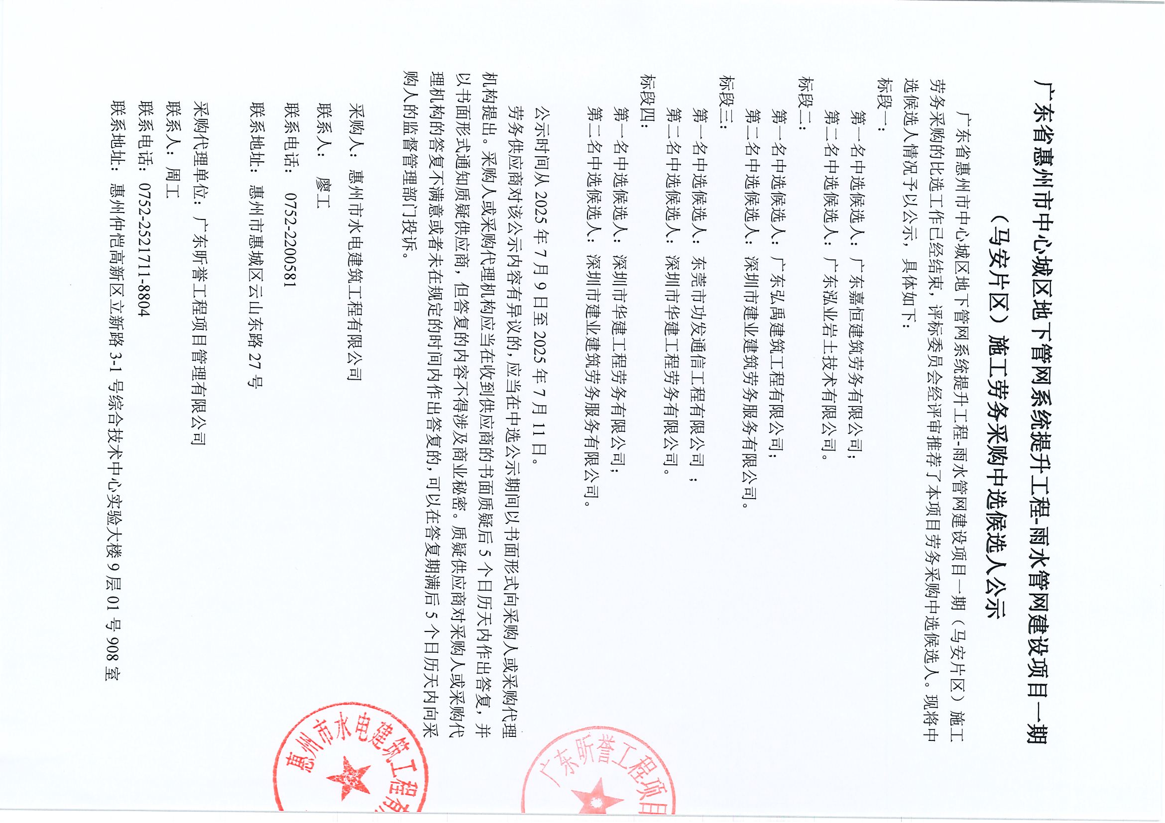 廣東省惠州市中心城區(qū)地下管網(wǎng)系統(tǒng)提升工程-高窟瀝流域排水管網(wǎng)完善項(xiàng)目施工勞務(wù)采購(gòu)中選候選人公示