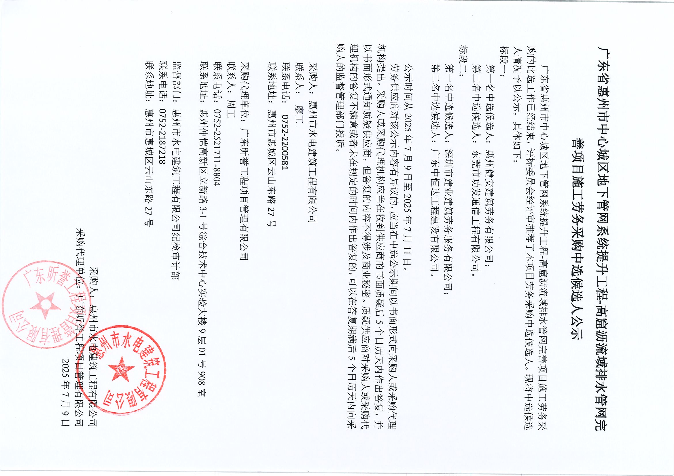 廣東省惠州市中心城區(qū)地下管網(wǎng)系統(tǒng)提升工程-高窟瀝流域排水管網(wǎng)完善項目施工勞務(wù)采購中選候選人公示
