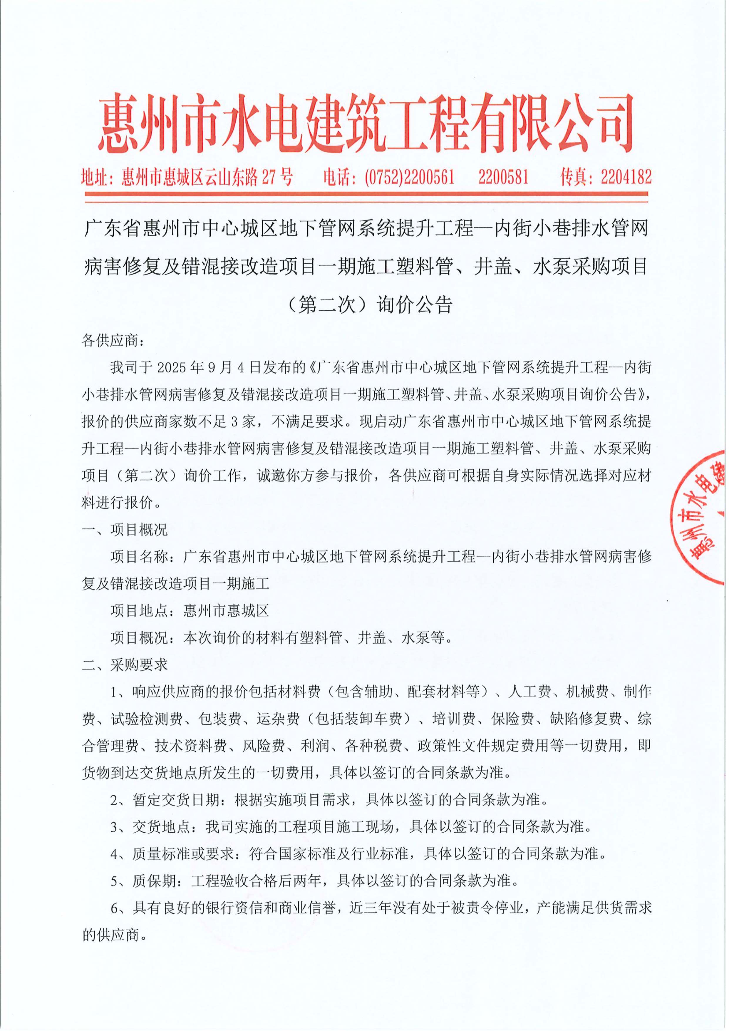 廣東省惠州市中心城區(qū)地下管網(wǎng)系統(tǒng)提升工程—內(nèi)街小巷排水管網(wǎng)病害修復(fù)及錯(cuò)混接改造項(xiàng)目一期施工塑料管、井蓋、水泵采購項(xiàng)目(第二次)詢價(jià)公告附件: