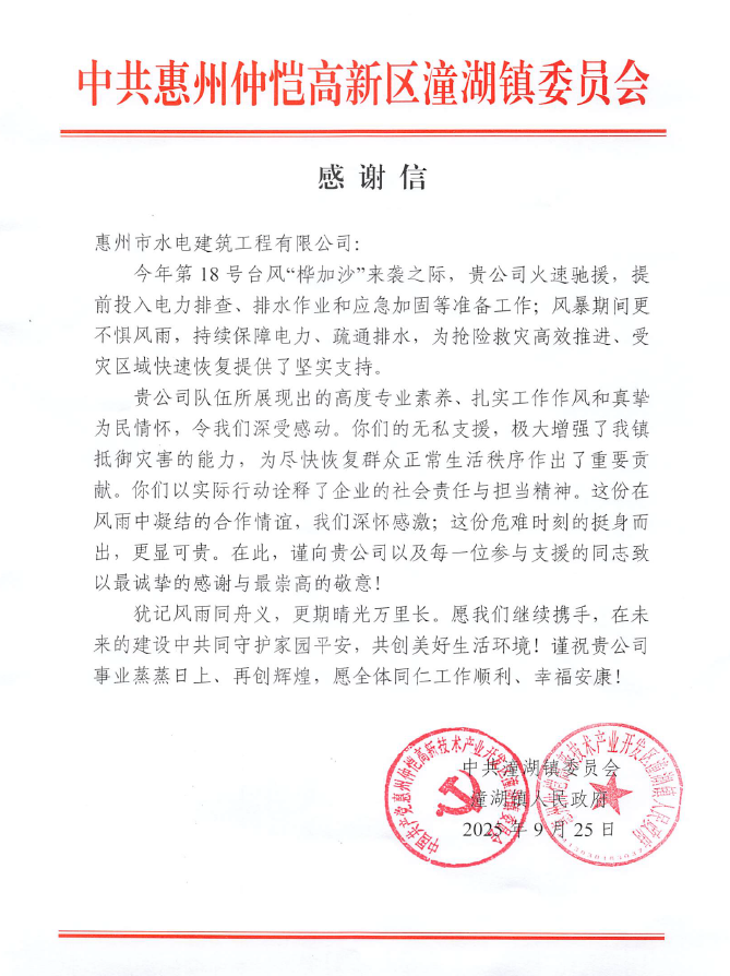 9月26日,仲愷高新區(qū)潼湖鎮(zhèn)政府向水電公司發(fā)來感謝信,來信指出,水電公司在第18號臺風(fēng)“樺加沙”來襲之際,火速馳援,提前投入電力排查、排水作業(yè)和應(yīng)急加固等準(zhǔn)備工作;風(fēng)暴期間更不懼風(fēng)雨,持續(xù)保障電力、疏通排水,為搶險救災(zāi)高效推進(jìn)、受災(zāi)區(qū)域快速恢復(fù)提供了堅實支持,體現(xiàn)了高度專業(yè)素養(yǎng)、扎實工作作風(fēng)和真摯為民情懷。
