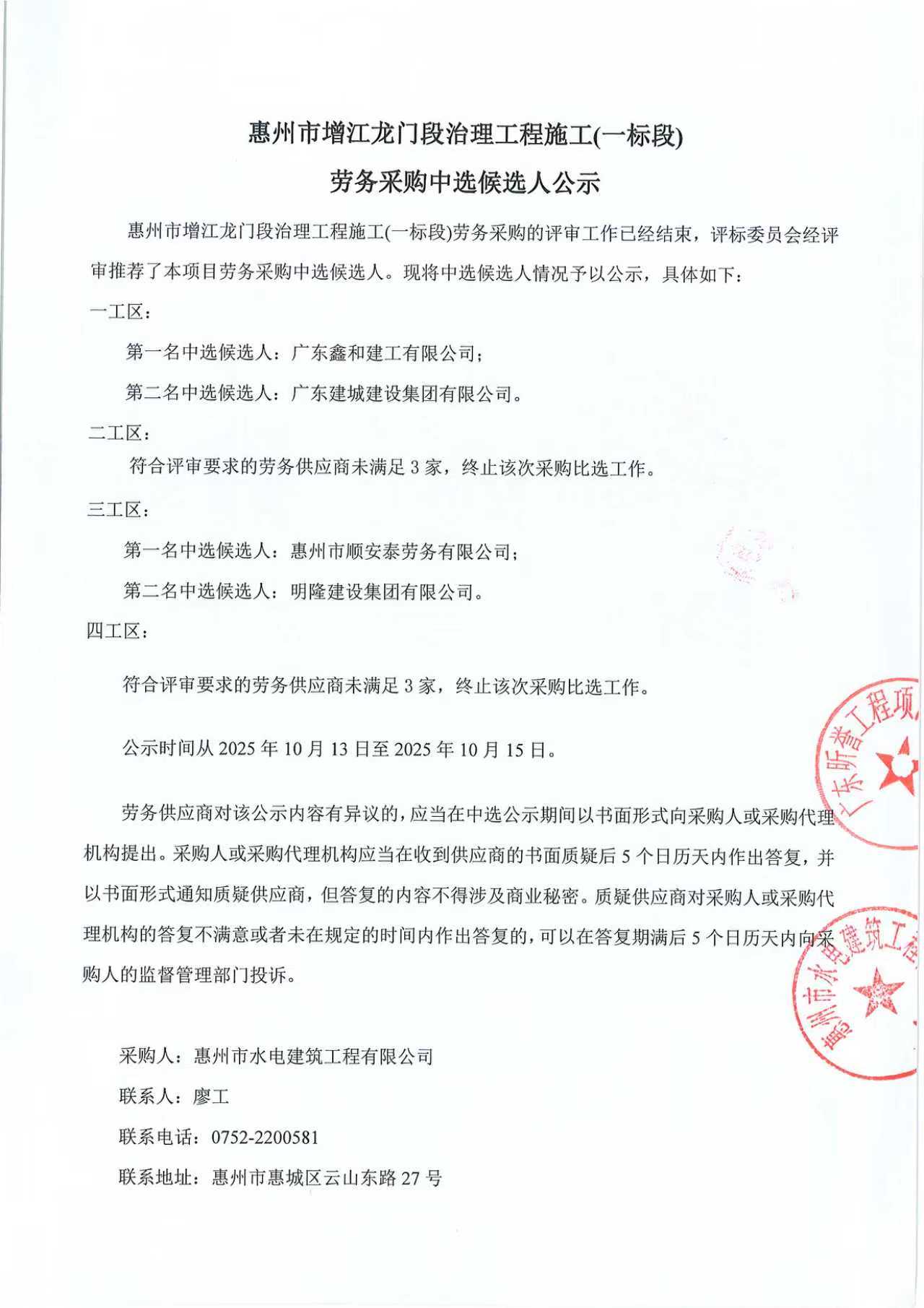 惠州市增江龍門段治理工程施工(一標(biāo)段)勞務(wù)采購(gòu)中選候選人公示