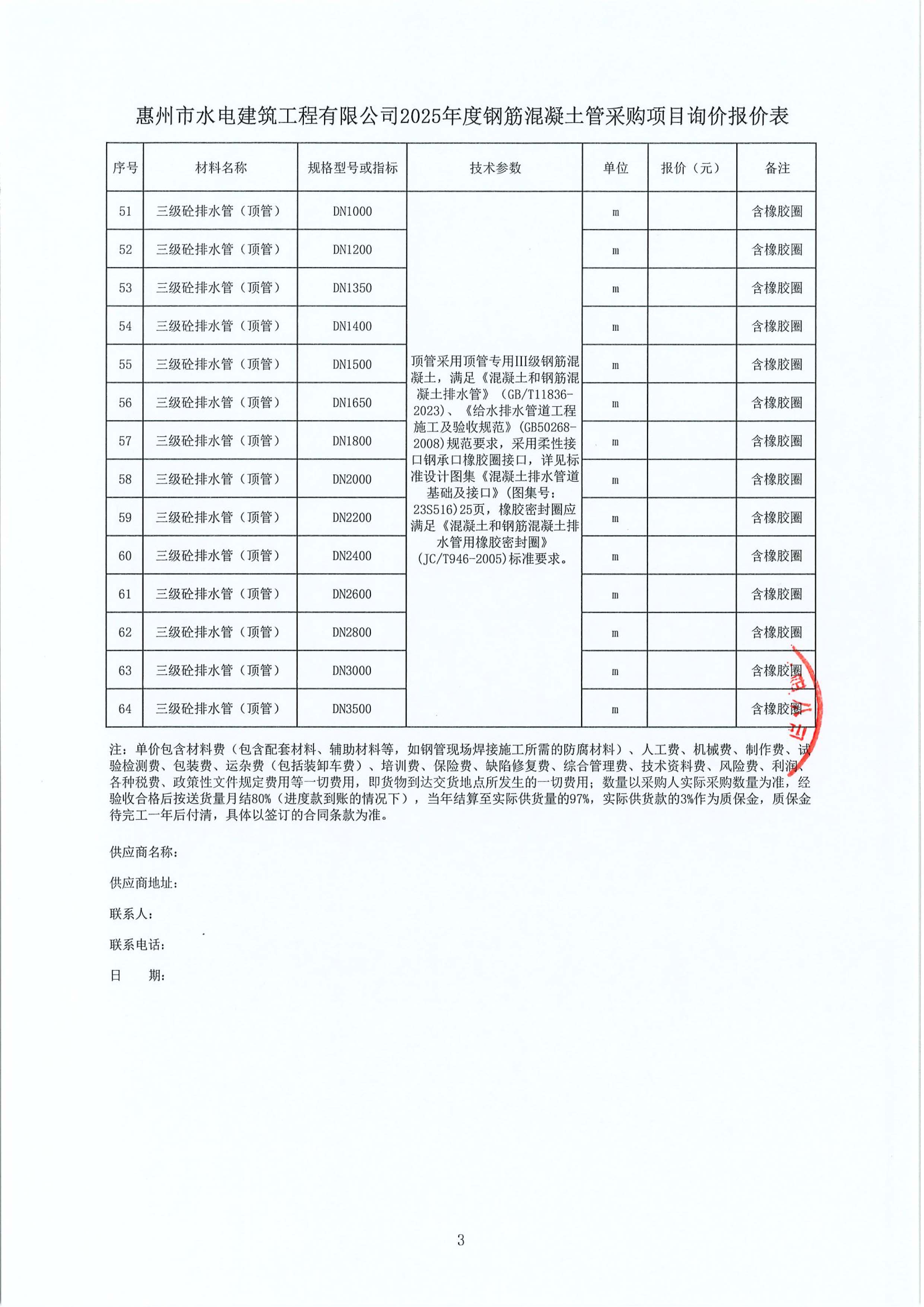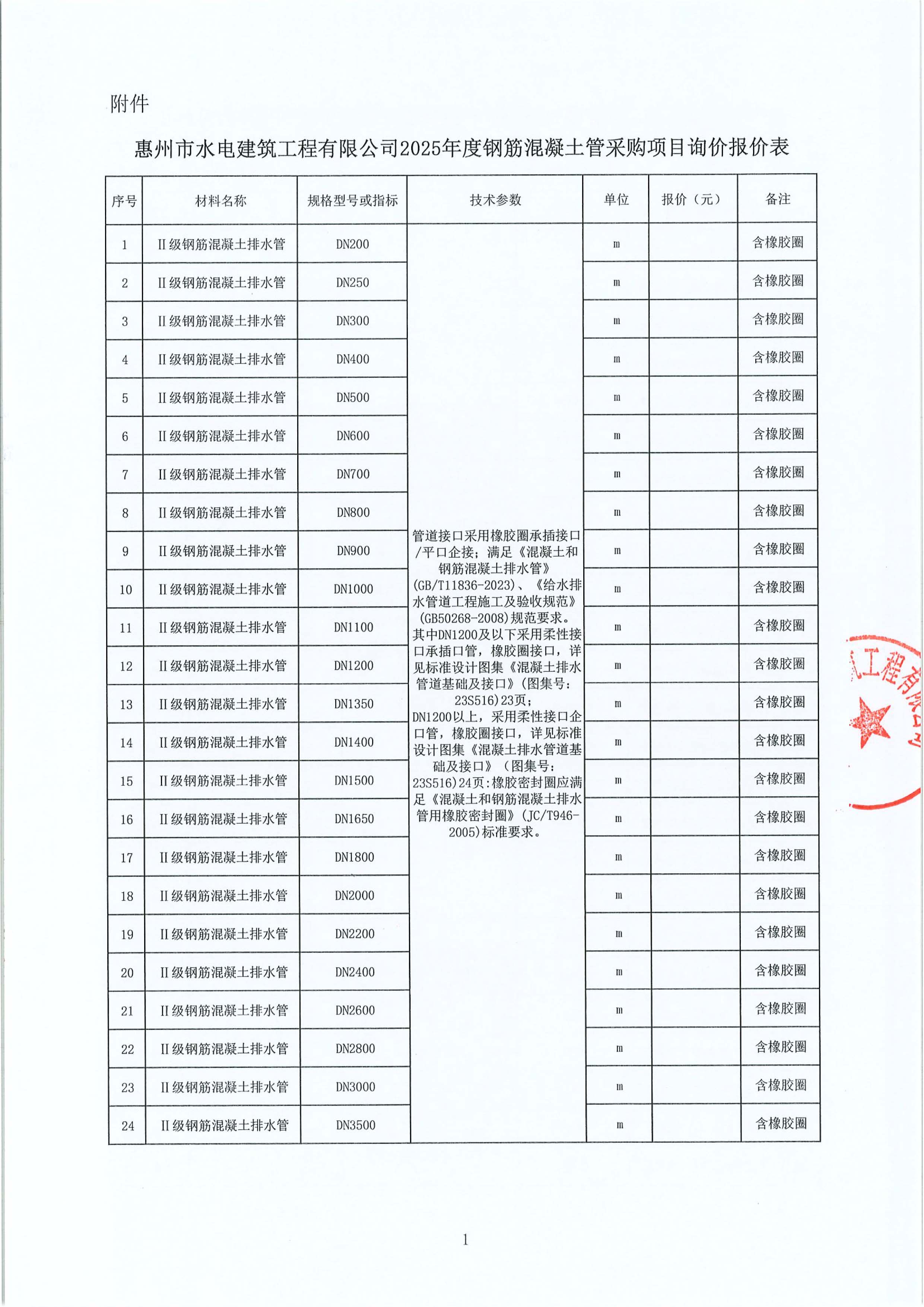 惠州市水電建筑工程有限公司2025年度鋼筋混凝土管采購項目詢價公告附件: