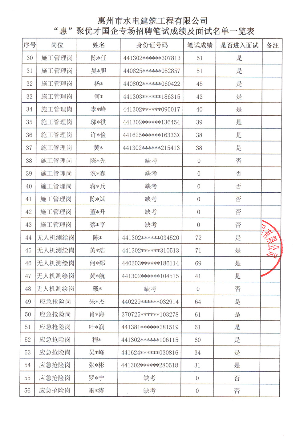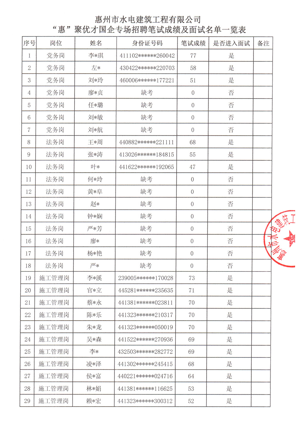 惠州市水電建筑工程有限公司“惠”聚優(yōu)才國企專場招聘會筆試成績及面試名單公示