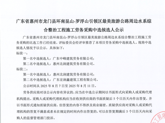 廣東省惠州市龍門縣環(huán)南昆山-羅浮山引領(lǐng)區(qū)最美旅游公路周邊水系綜合整治工程施工勞務(wù)采購(gòu)中選候選人公示......