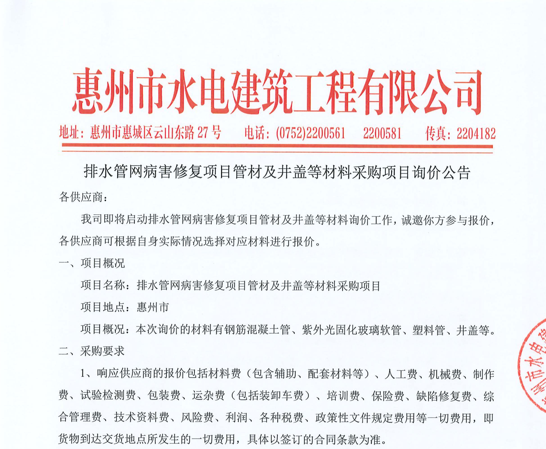 排水管網(wǎng)病害修復(fù)項(xiàng)目管材及井蓋等材料采購(gòu)項(xiàng)目詢價(jià)公告......