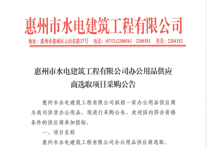 惠州市水電建筑工程有限公司辦公用品供應(yīng)商選取項(xiàng)目采購(gòu)公告......