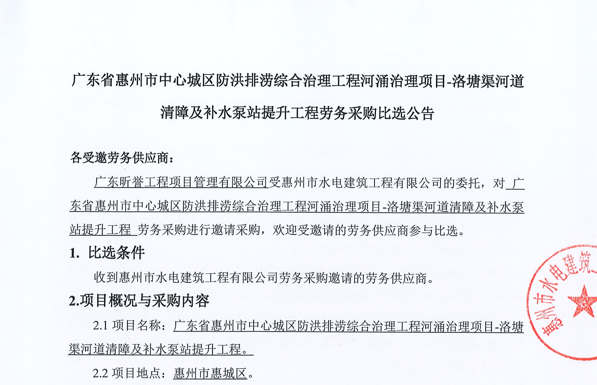 廣東省惠州市中心城區(qū)防洪排澇綜合治理工程河涌治理項(xiàng)目-洛塘渠河道清障及補(bǔ)水泵站提升工程勞務(wù)采購(gòu)比選公告......