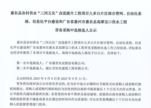 惠東縣農(nóng)村供水“三同五化”改造提升工程項(xiàng)目九多白片區(qū)部分管網(wǎng)、自動(dòng)化系統(tǒng)、信息化平臺(tái)建設(shè)和廣東省惠州市惠東縣高潭寶口供水工程勞務(wù)采購(gòu)中選候選人公示......