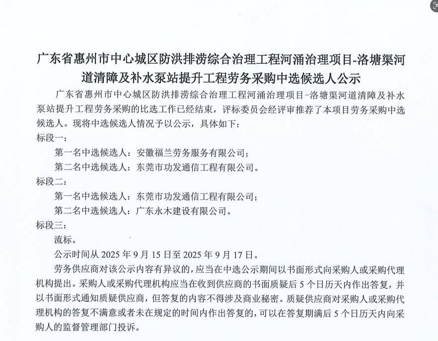 廣東省惠州市中心城區(qū)防洪排澇綜合治理工程河涌治理項(xiàng)目-洛塘渠河道清障及補(bǔ)水泵站提升工程勞務(wù)采購(gòu)中選候選人公示......