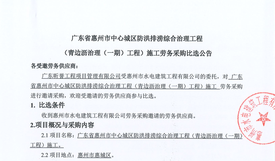 廣東省惠州市中心城區(qū)防洪排澇綜合治理工程(青邊瀝治理(一期)工程)施工勞務采購比選公告......