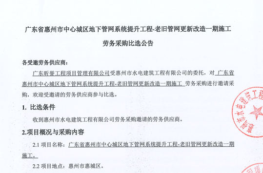 廣東省惠州市中心城區(qū)地下管網(wǎng)系統(tǒng)提升工程-老舊管網(wǎng)更新改造一期施工勞務采購比選公告......