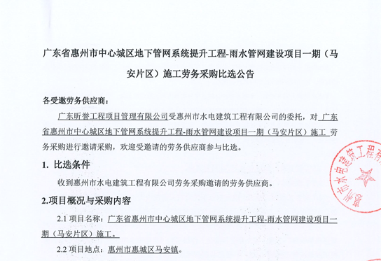 廣東省惠州市中心城區(qū)地下管網(wǎng)系統(tǒng)提升工程-雨水管網(wǎng)建設(shè)項目一期(馬安片區(qū))施工勞務采購比選公告......