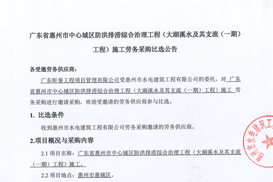 廣東省惠州市中心城區(qū)防洪排澇綜合治理工程(大湖溪水及其支流(一期)工程)施工勞務采購比選公告......
