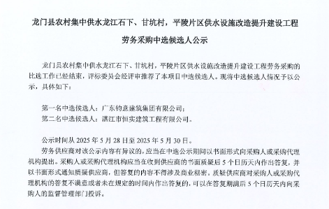 龍門(mén)縣農(nóng)村集中供水龍江石下、甘坑村,平陵片區(qū)供水設(shè)施改造提升建設(shè)工程勞務(wù)采購(gòu)中選候選人公示......