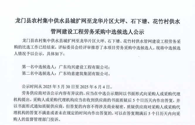龍門(mén)縣農(nóng)村集中供水龍華片區(qū)擴(kuò)網(wǎng)至四圍、西溪村供水管網(wǎng)建設(shè)工程勞務(wù)采購(gòu)中選候選人公示......
