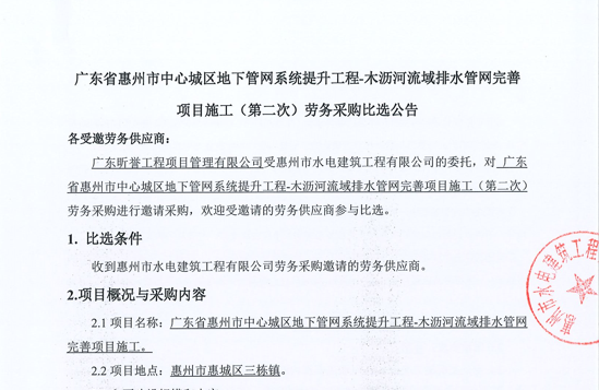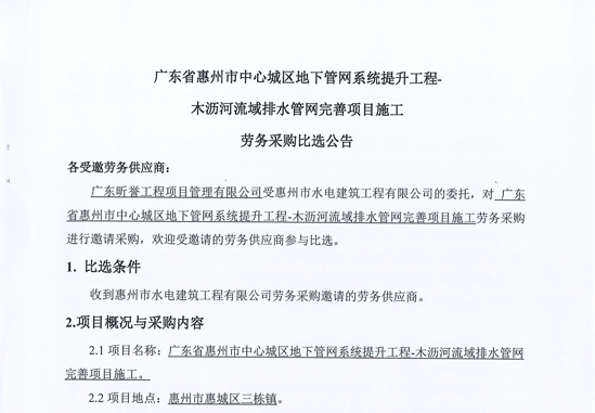 廣東省惠州市中心城區(qū)地下管網(wǎng)系統(tǒng)提升工程-木瀝河流域排水管網(wǎng)完善項(xiàng)目施工(第二次)勞務(wù)采購(gòu)比選公告......