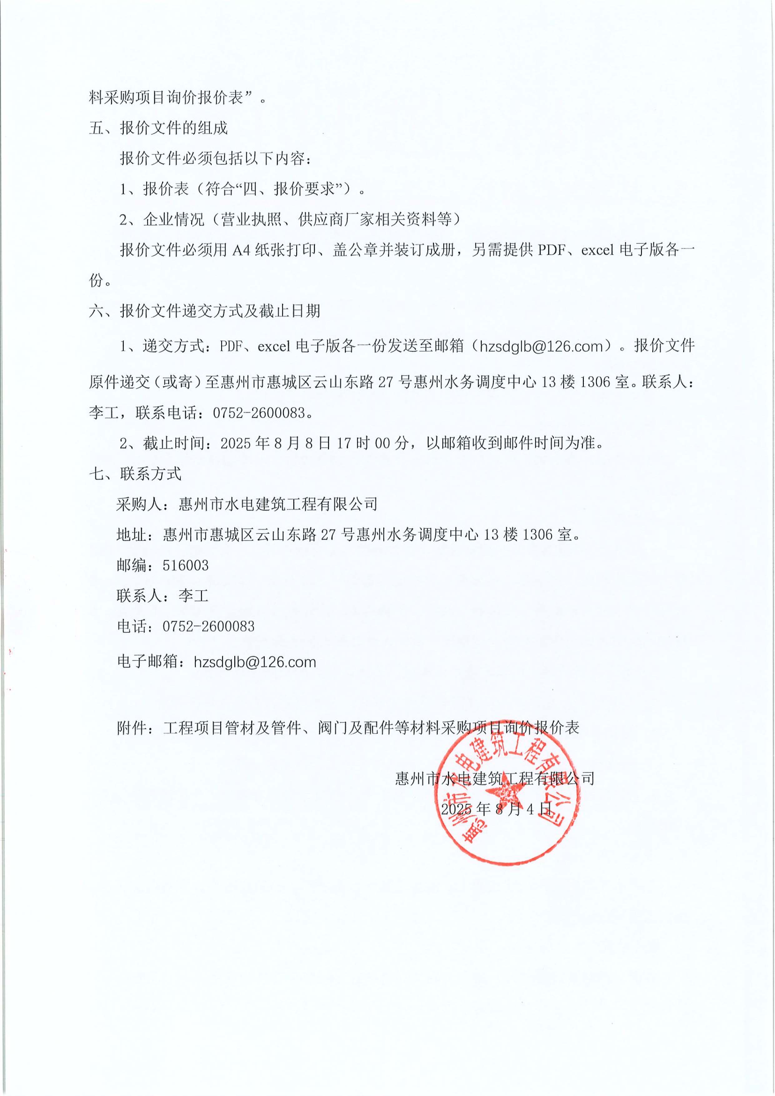 工程項目管材及管件、閥門及配件等材料采購項目詢價公告